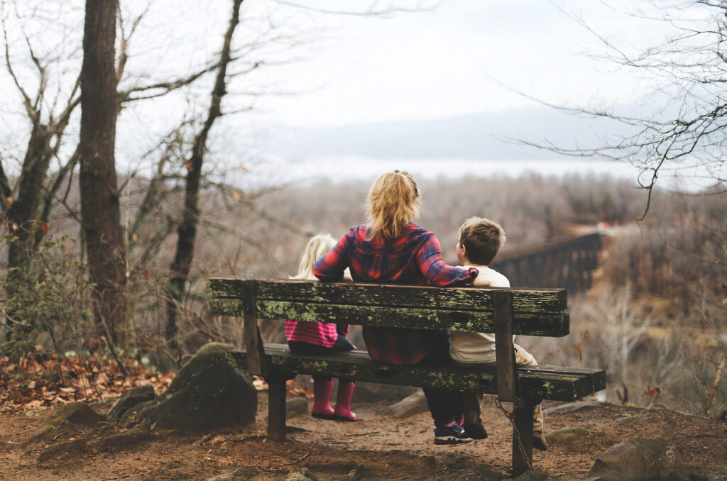Vejbyhem, mamma med två barn sitter på en bänk